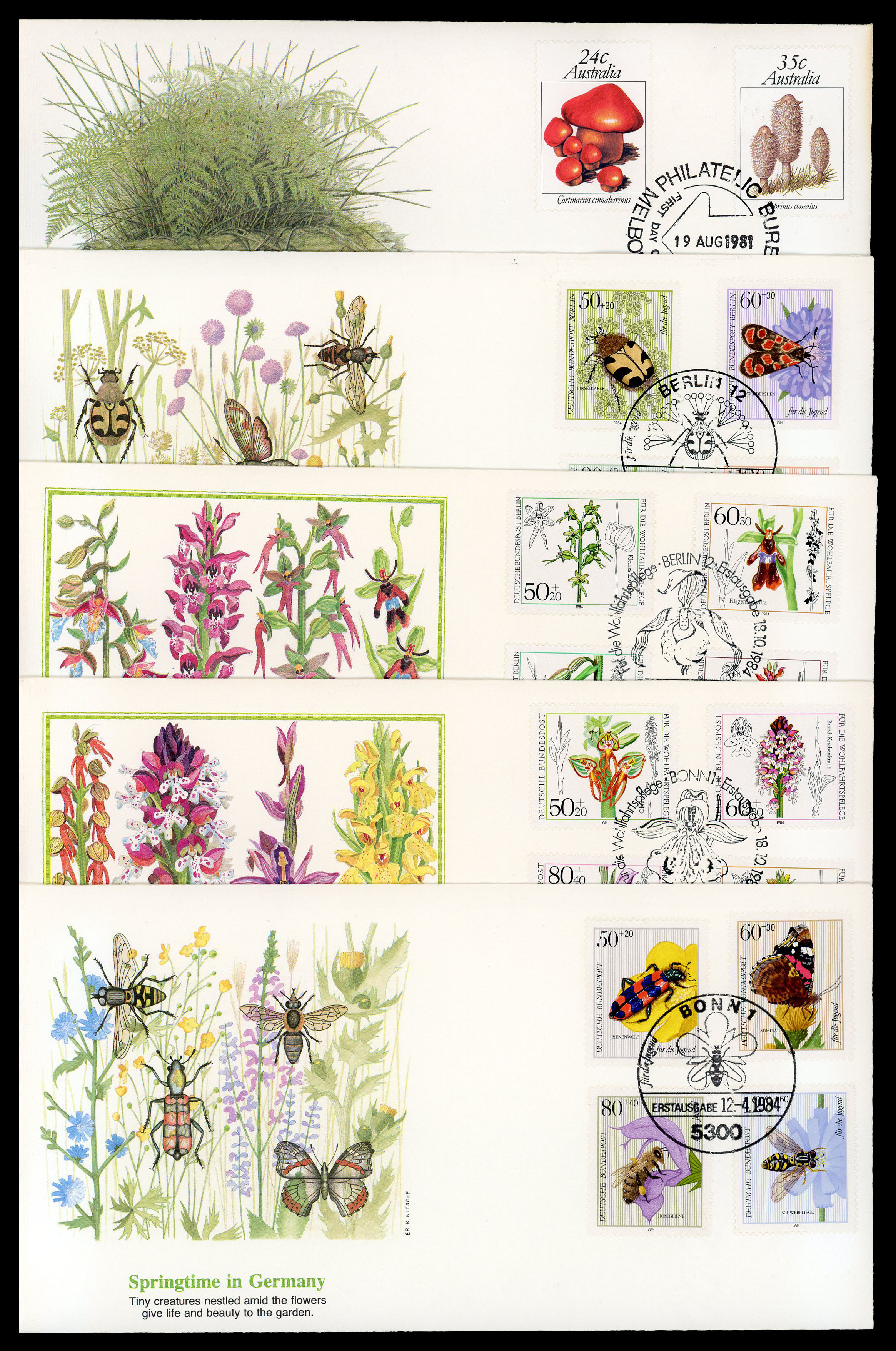 Collection de 5 plis premiers jours Fleetwood avec cachets et timbres d’insectes, de fleurs ou de champignons.