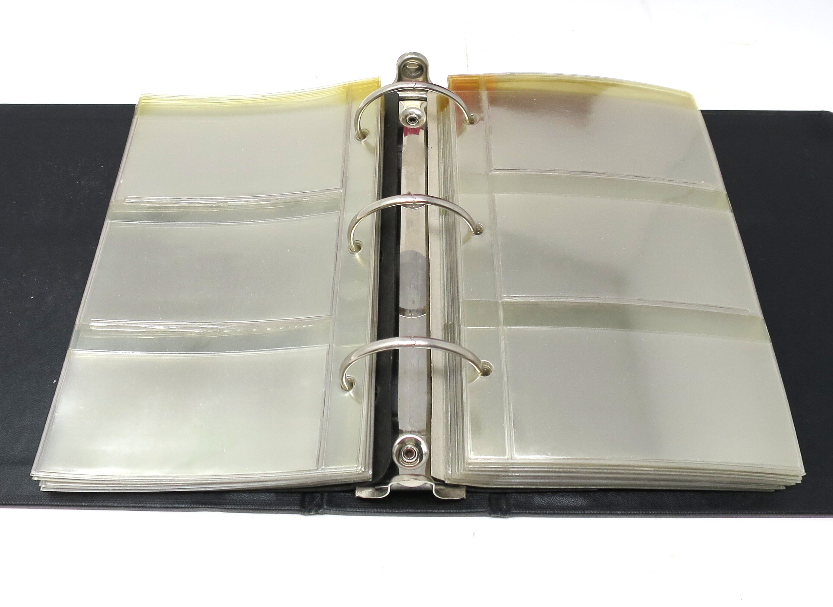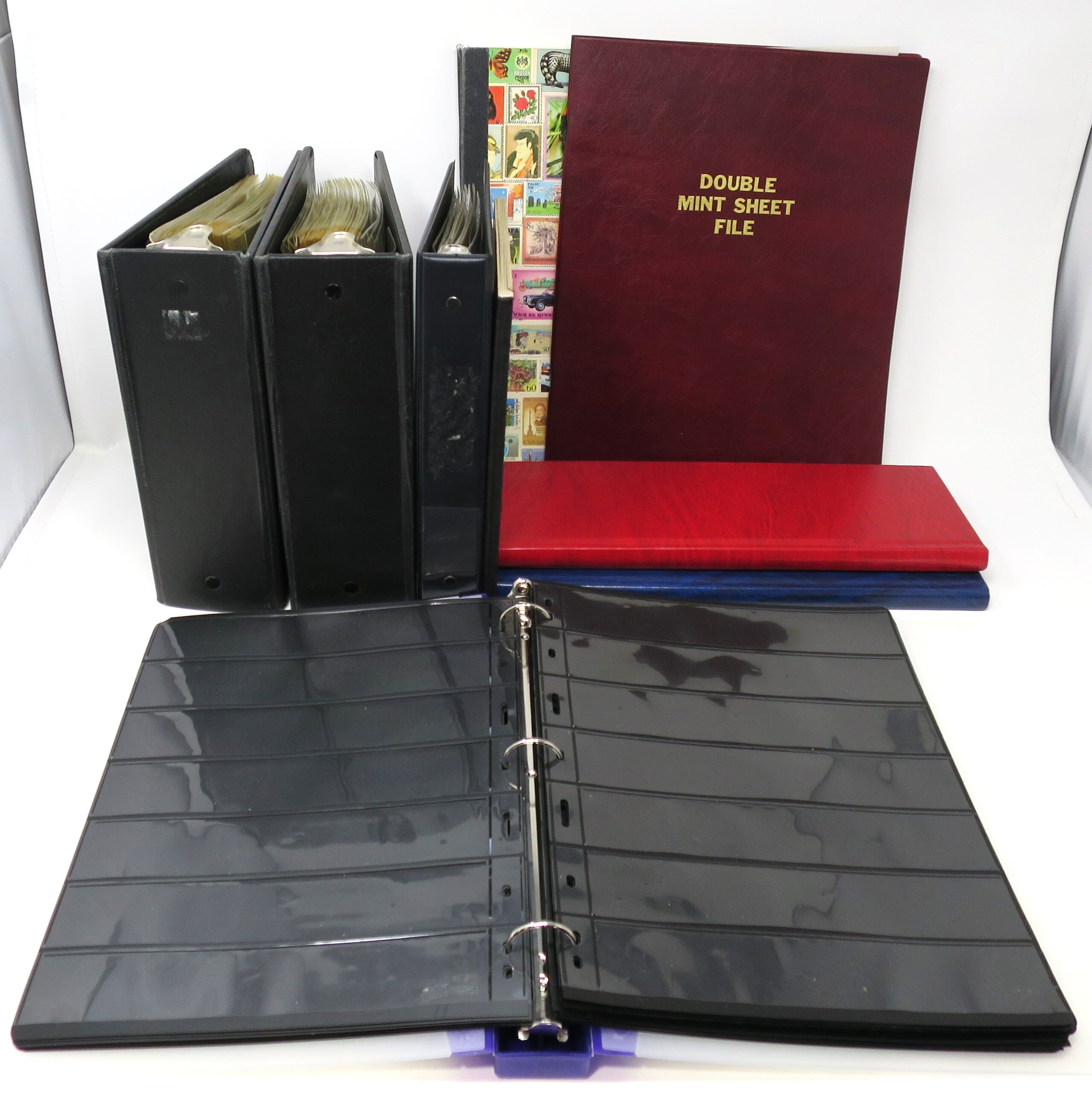 La collection comprend 3 petits cartables noirs avec des feuilles en acétate pour ranger des cartes #102, 4 classeurs de formats différents, 1 album de rangement pour feuilles complètes de timbres et 1 cartable avec 25 feuilles de classement noires. Valeur de la collection 135.00$+.