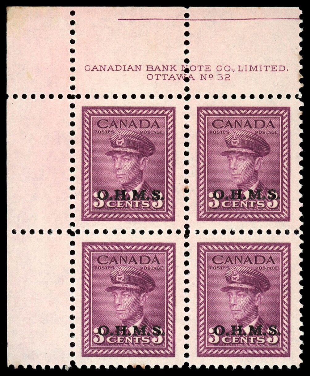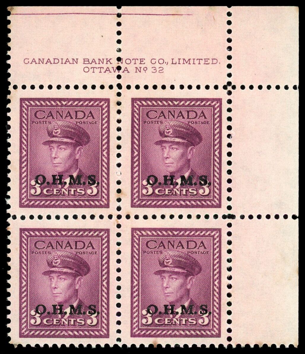Le Roi George VI, "O.H.M.S" surimprimé - Violet Rose. 3¢. Timbre du Canada surimprimé officiel O3 de l'émission effort de guerre.