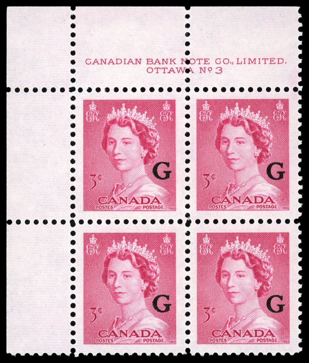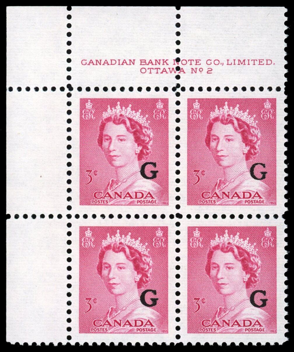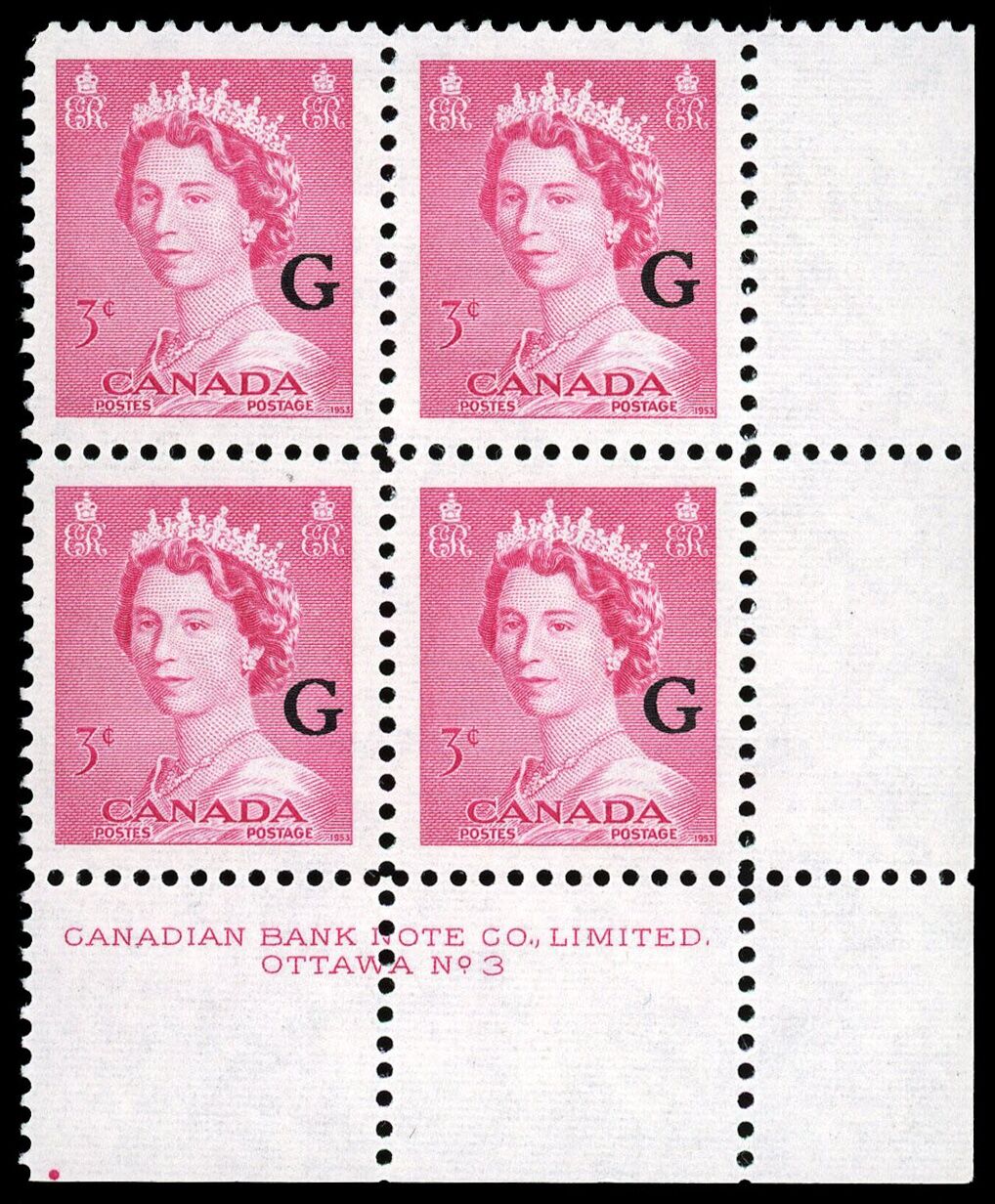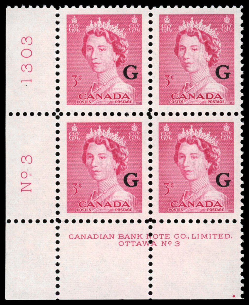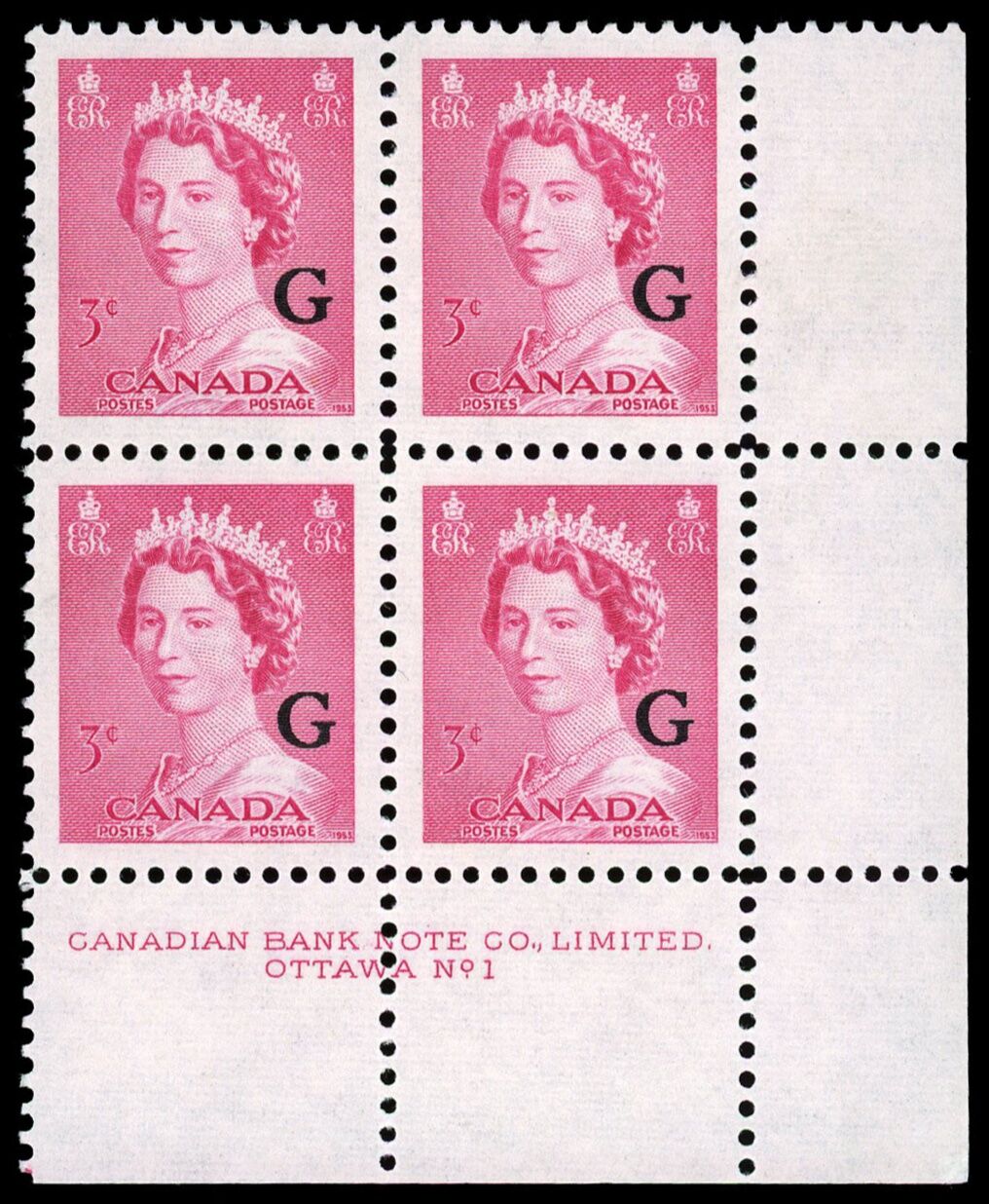 La Reine Elizabeth II, "G" surimprimé - Rose Carmin. 3¢. Timbre du Canada surimprimé officiel O35 de l'émission portrtait "krash".