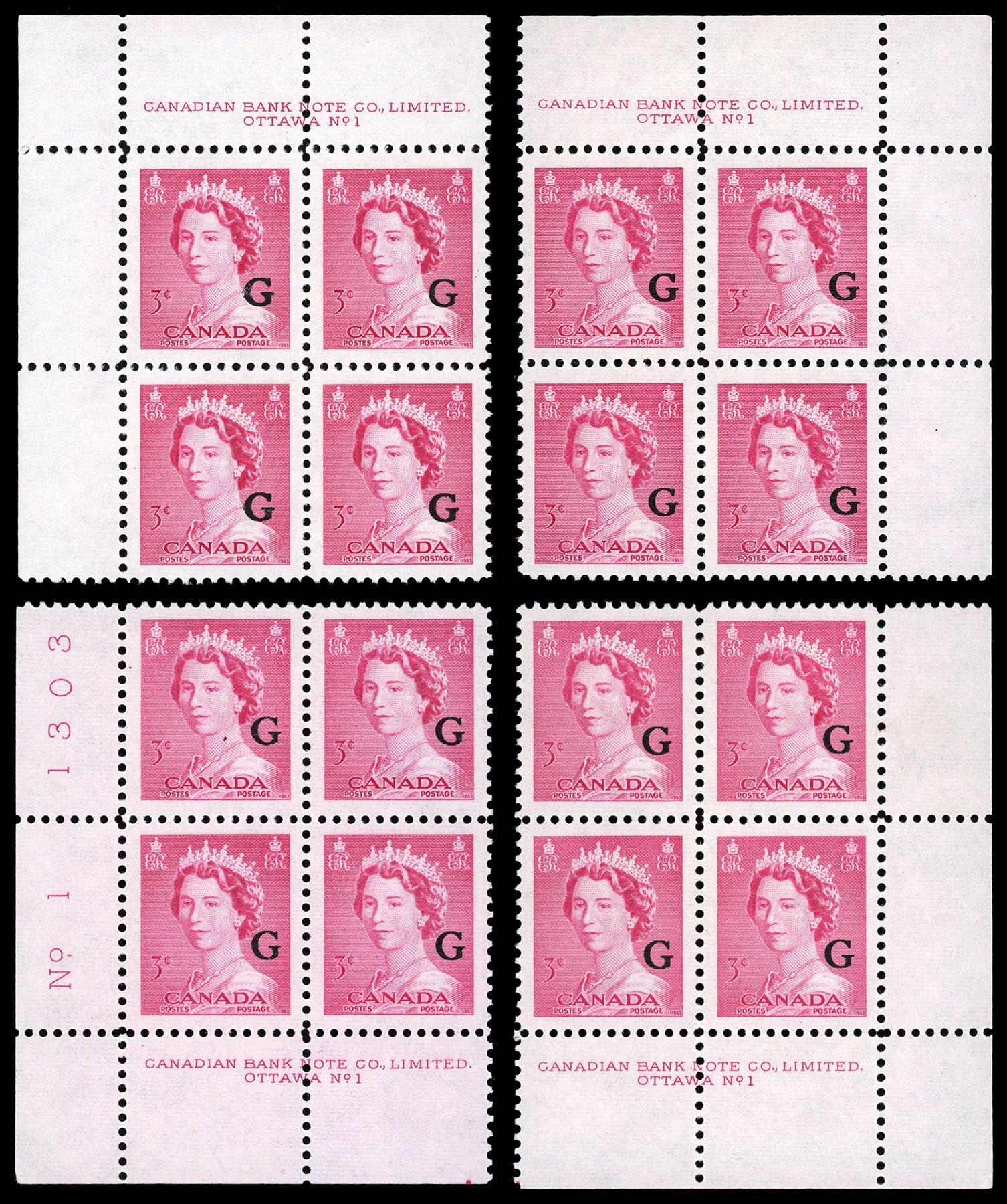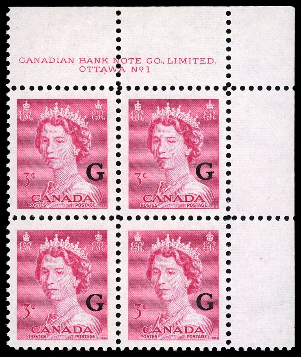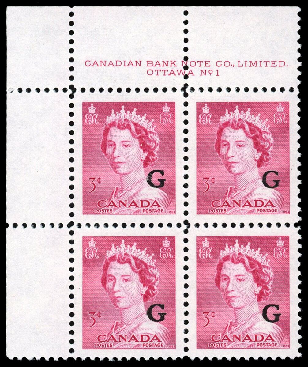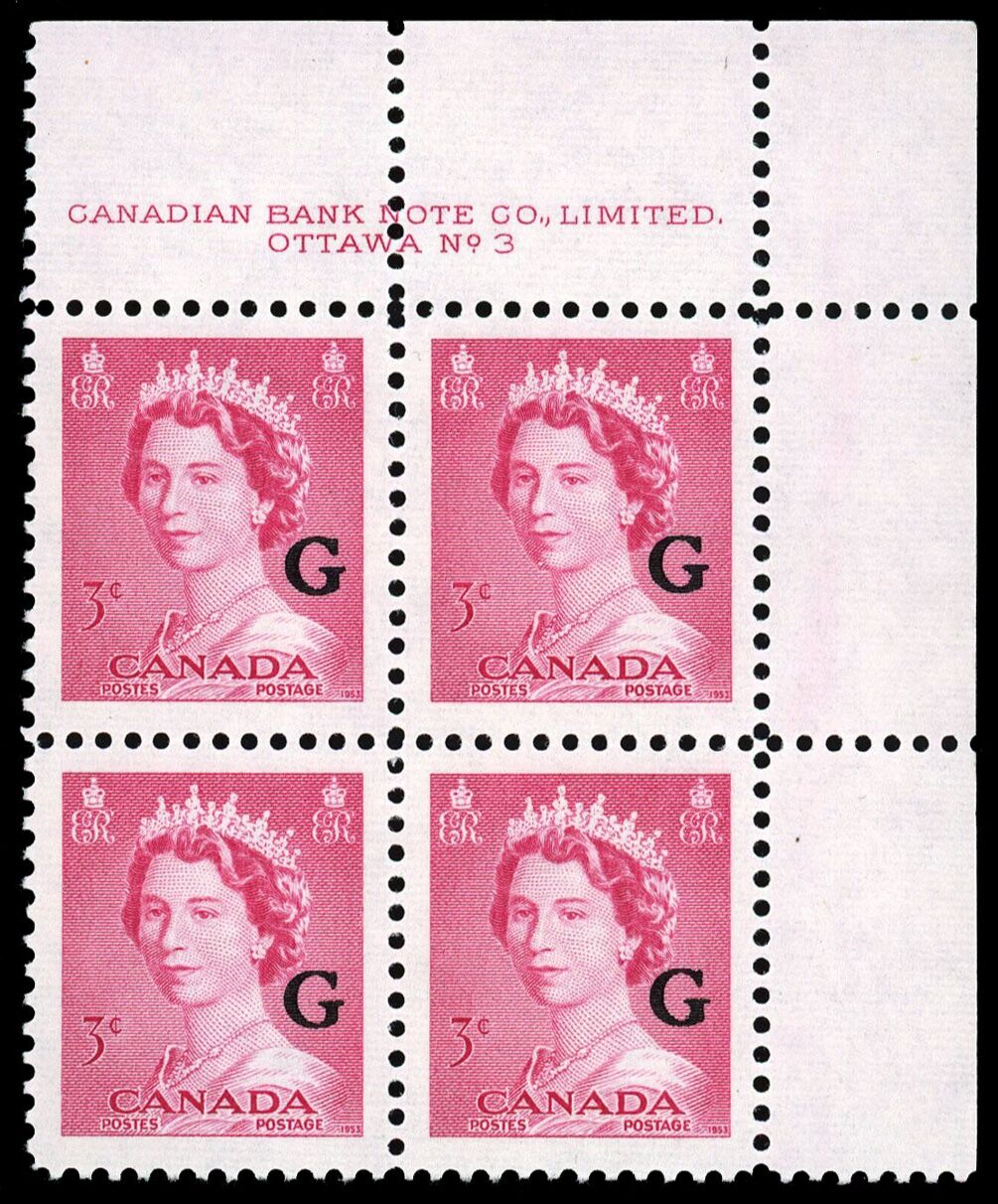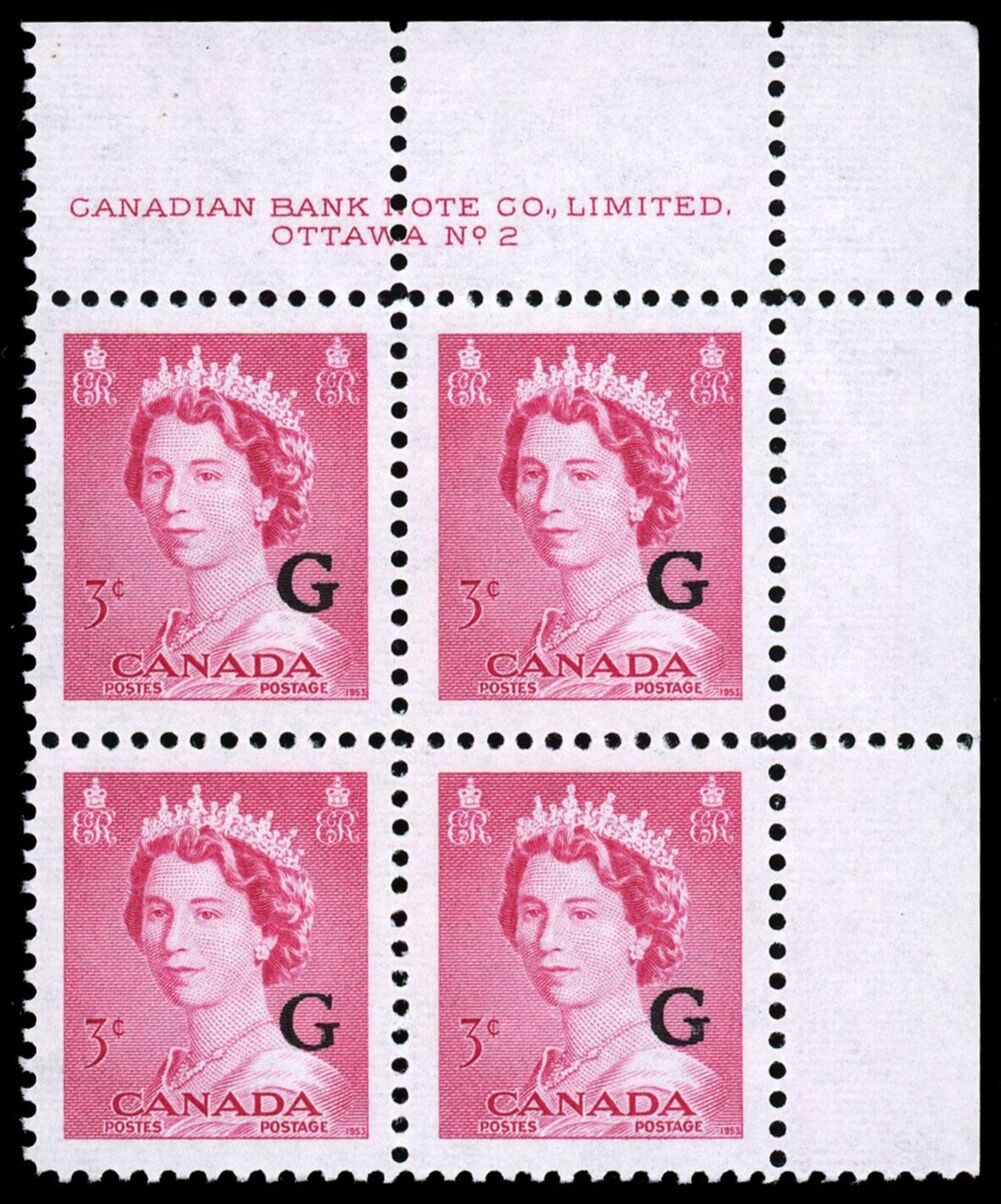 La Reine Elizabeth II, "G" surimprimé - Rose Carmin. 3¢. Timbre du Canada surimprimé officiel O35 de l'émission portrtait "krash".