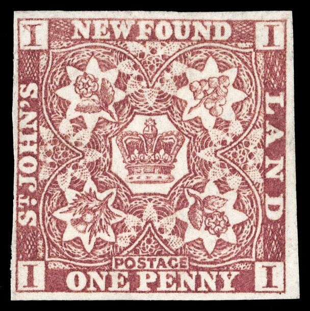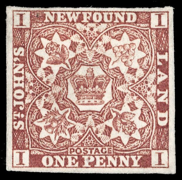 Premium exemplaire frais inutilisé du premier timbre de Terre-Neuve avec quatre marges spacieuses équilibrées, un denier, émission de 1857, brun violet, 22 mm x 22,5 mm, papier vélin avec mailles, un joli timbre !
