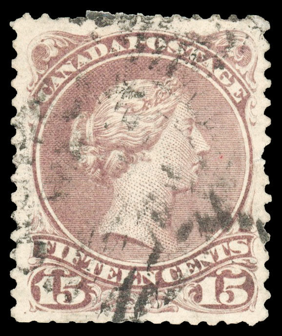 Fraîche Reine Victoria (1868) 15¢ avec la magnifique et beaucoup plus rare nuance Lilas Rouge! Splendide et très intéressante OBLITÉRATION FANTASIQUE au BOUCHON.
