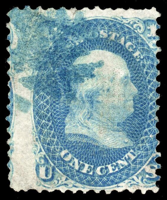 Erreur de décalage de perforation importante. Une bonne partie du motif à droite du timbre est manquante, mais une partie du motif du timbre à sa gauche est présente. Oblitération bleu.