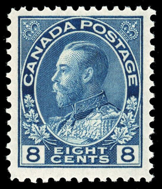 Almost Very Fine, would definitely be a Very Fine centring without those huge JUMBO margins, fresh & never hinged Canada #115 King George V "Admiral" (1925) 8¢.