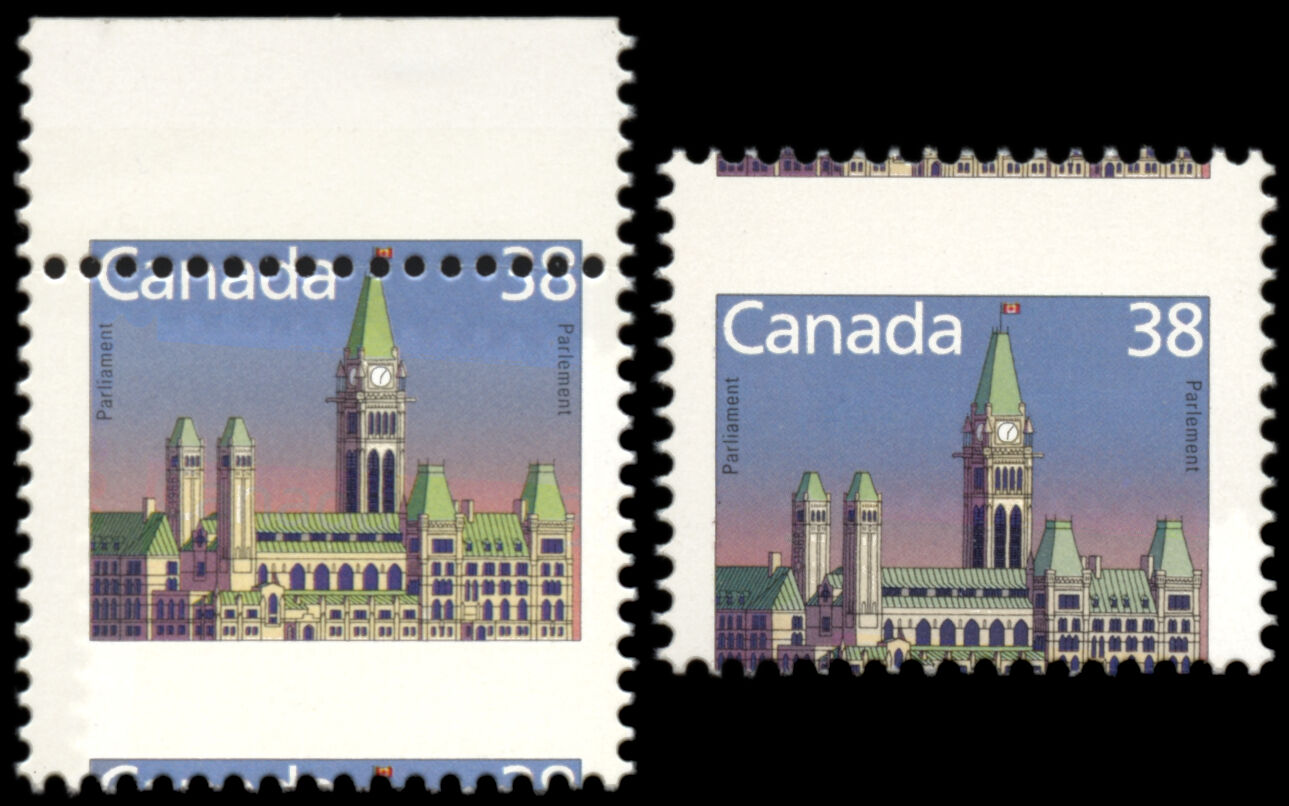 Very impressive pair of the multicoloured 38¢ Parliament definitive on Slater paper from 1988 with a downward perforation shift of 4 mm, which is splitting in half the "38" facial value and "Canada" inscription on top inside the upper perforations!