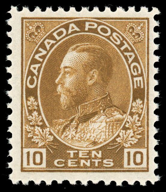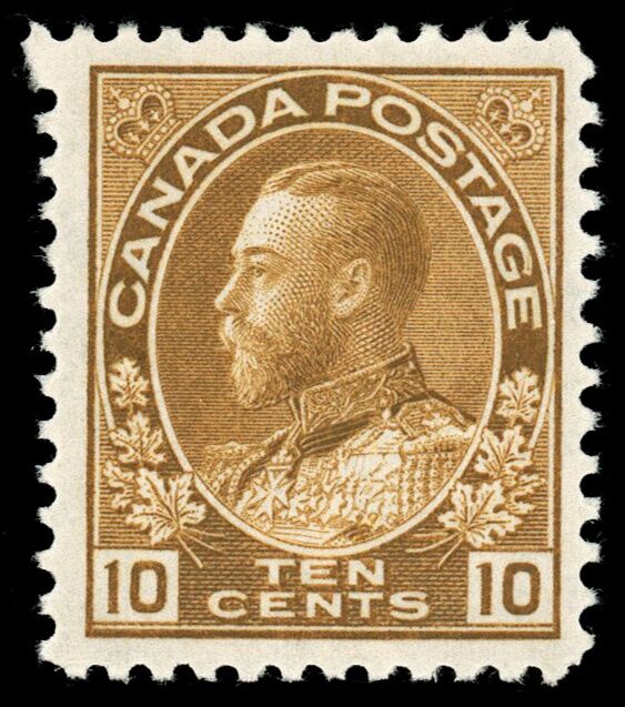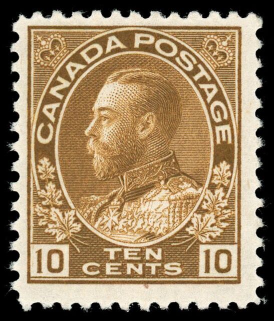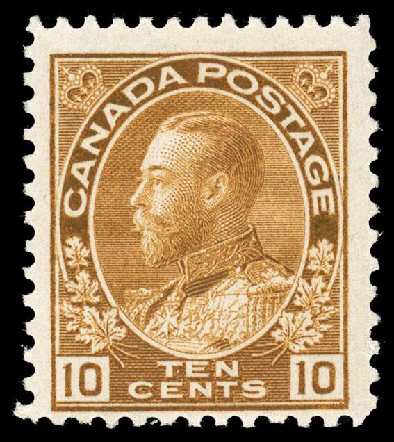Almost very fine, fresh and never hinged King George V "Admiral" (1925) 10¢ with the rarest Yellow Brown (#118b) shade.