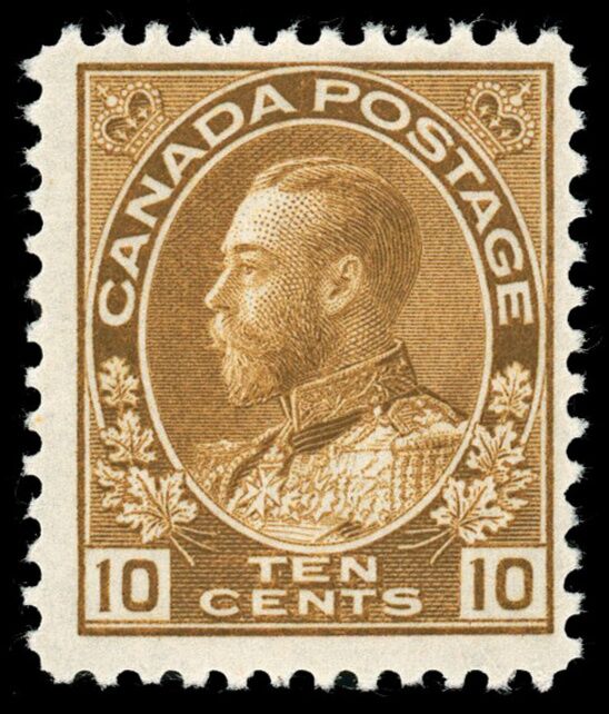 Fresh and never hinged King George V "Admiral" (1925) 10¢ with the rarest Yellow Brown (#118b) shade.