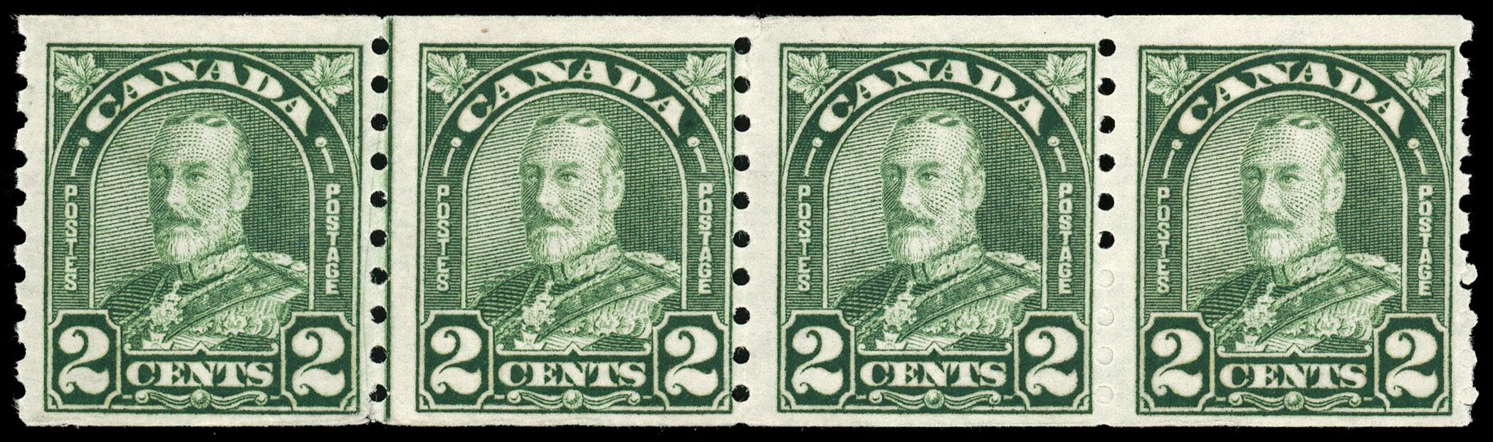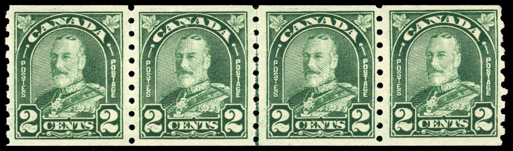 Canada Stamp #180i Line Strip of 4 - King George V Coil (1931) 4 x 2¢ Mint - Fine Never Hinged.