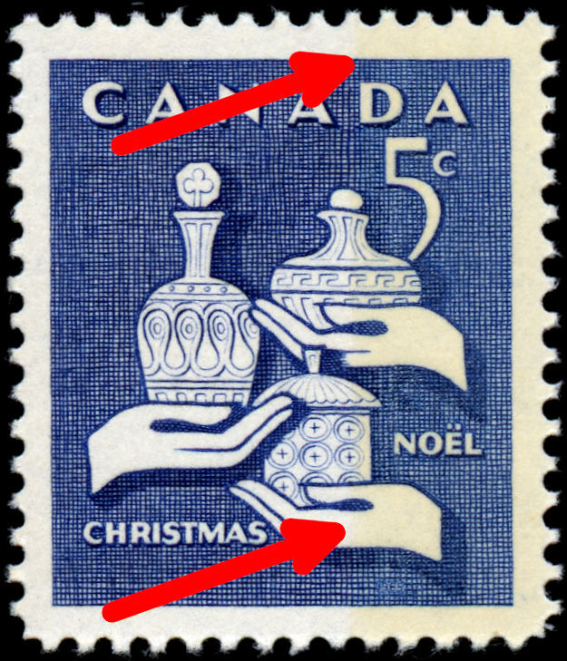 1965 5¢ Christmas stamp with a major tagging shift, resulting in a HUGE one bar of Winnipeg tagging on the right of the stamp, easily visible without a UV light!