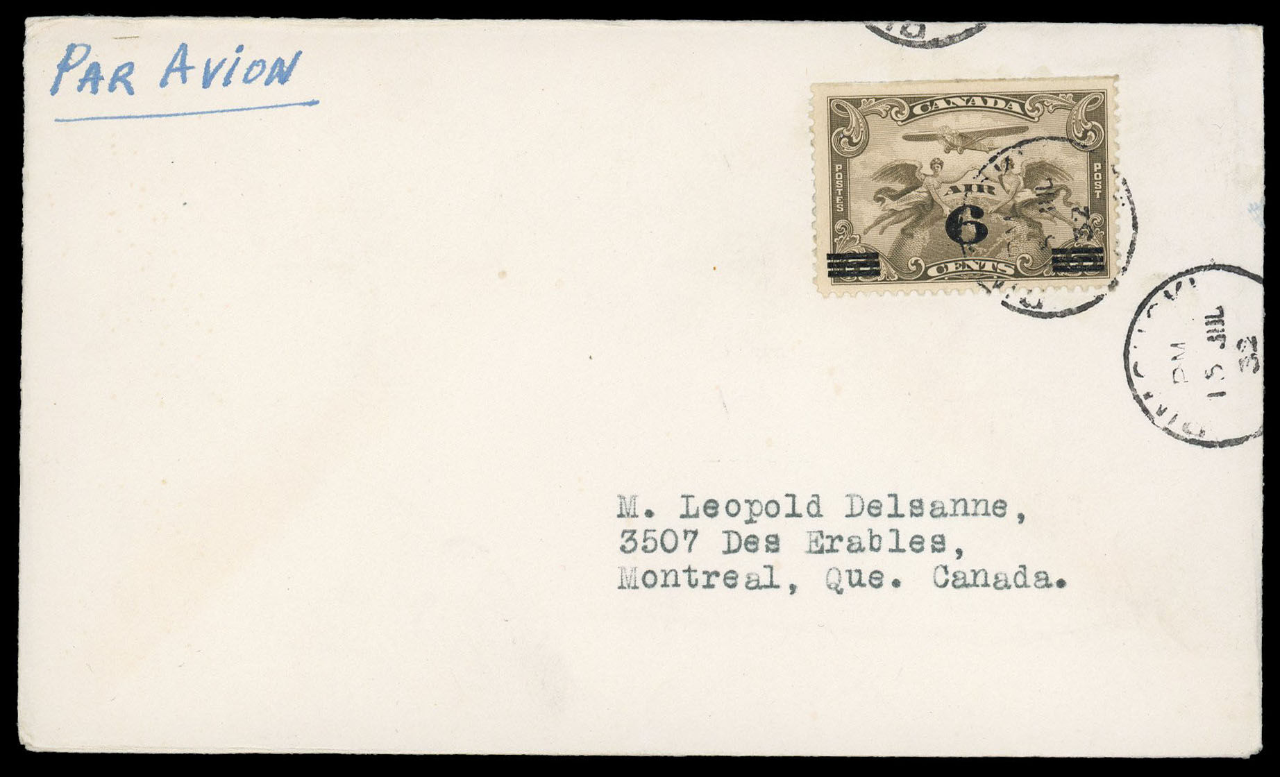 Canada Stamp - C - Air Mail #C3 - C1 Surcharged (Two winged figures against globe) (1932) 6¢