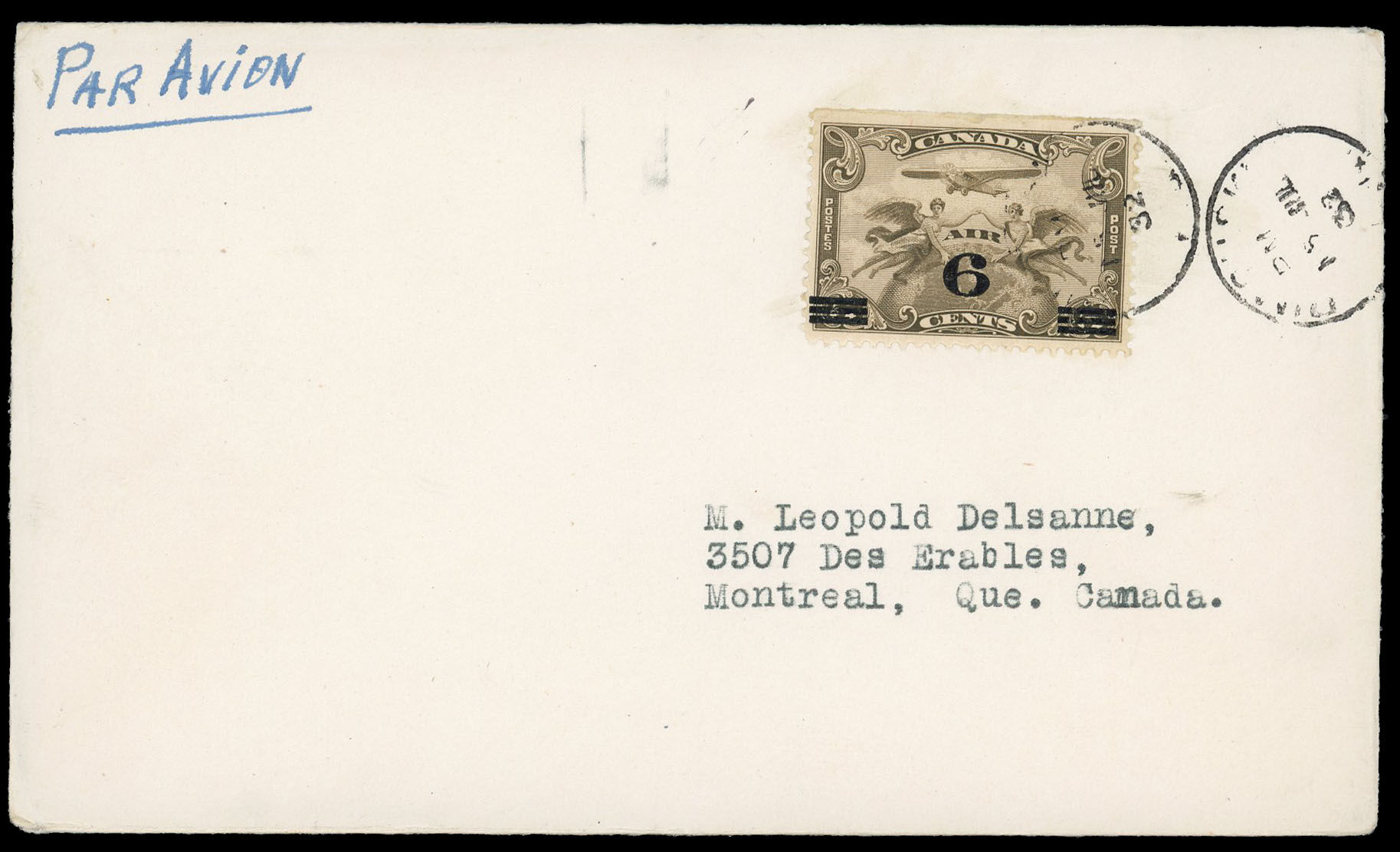 Two winged figures against globe - Brown Olive (C1 surchanged). 6¢ on 5¢. Canada air mail stamp C3.