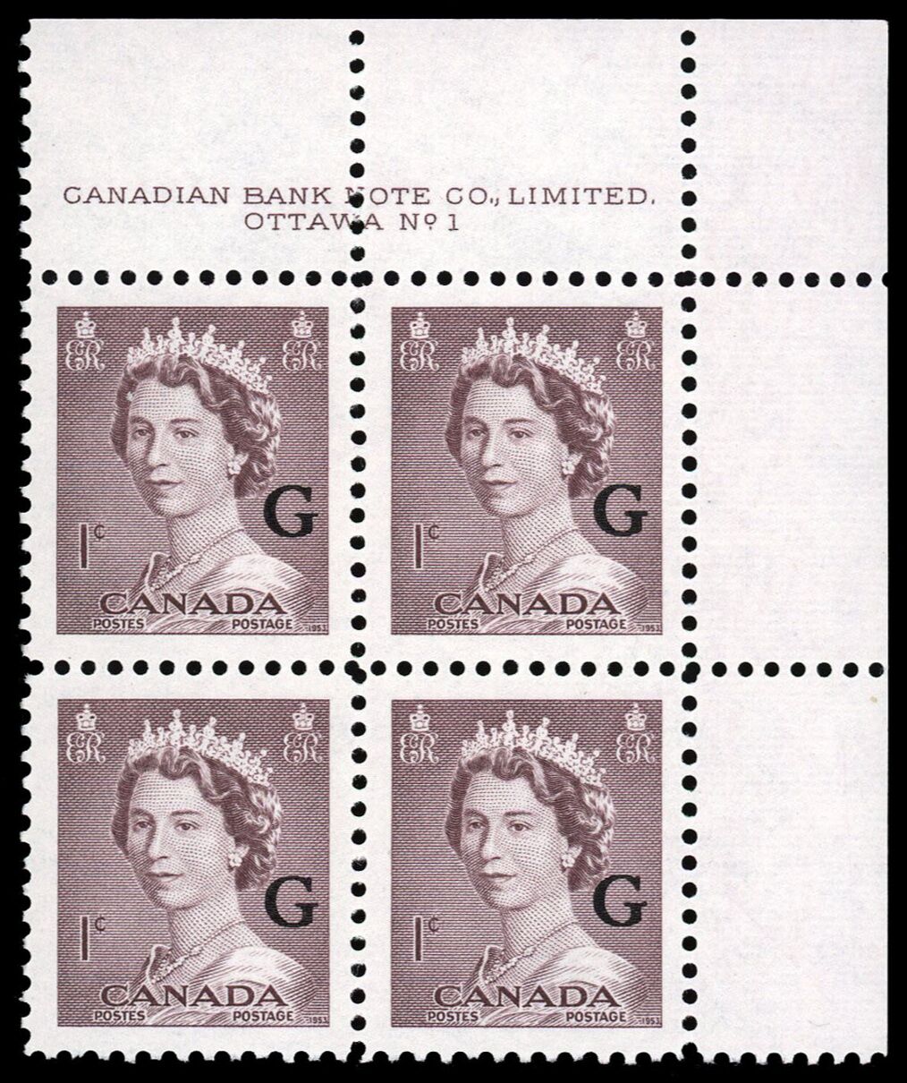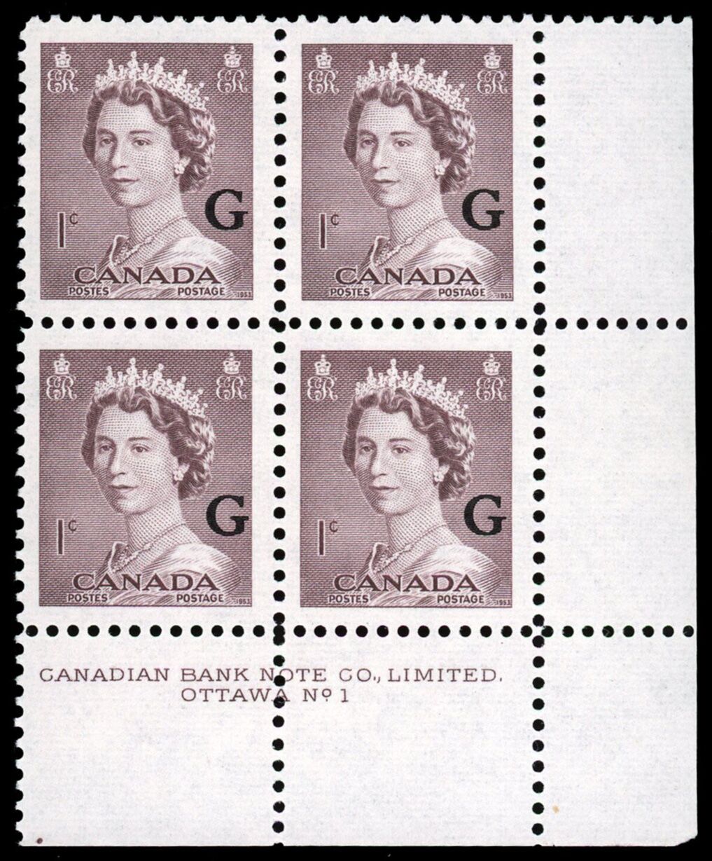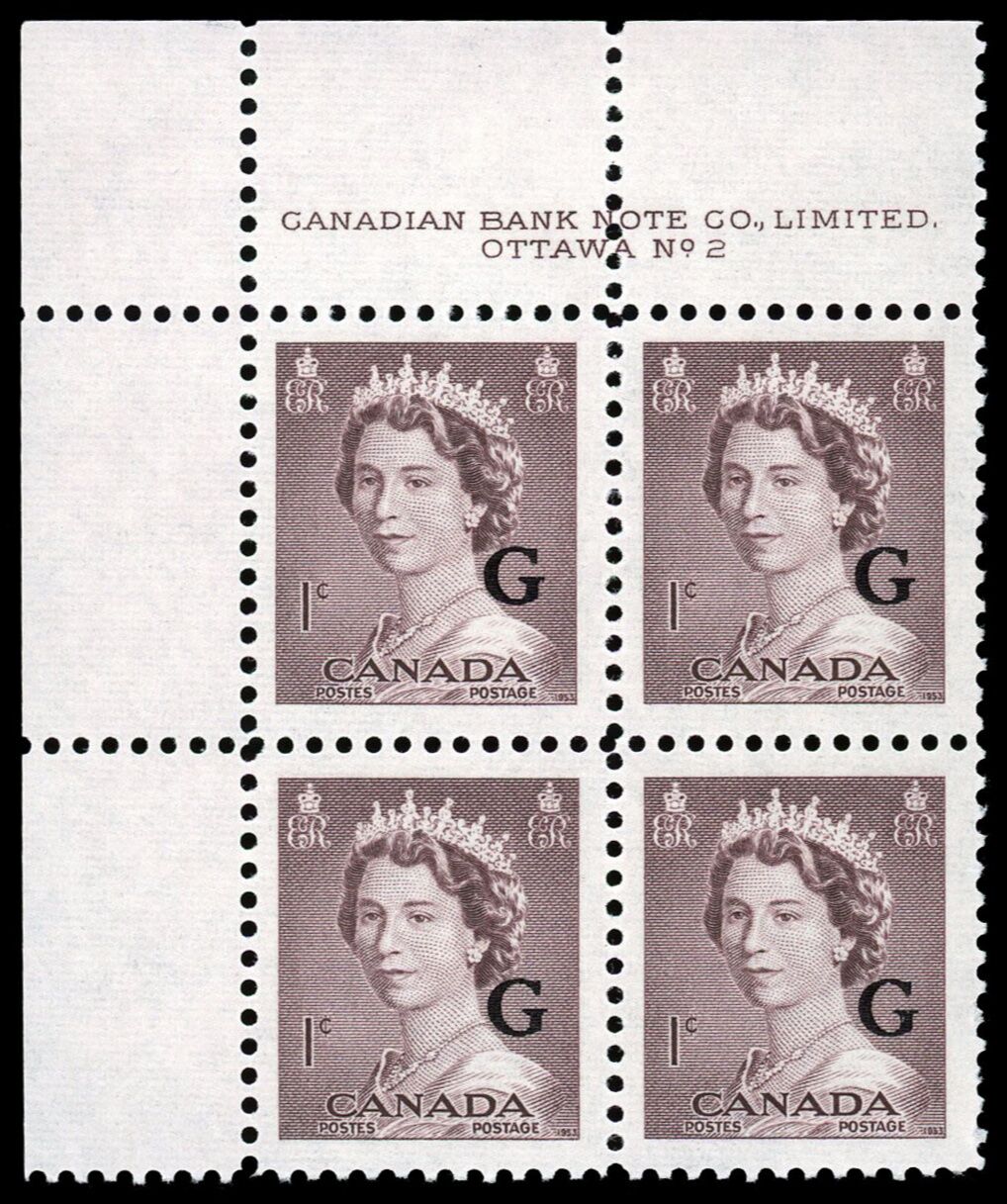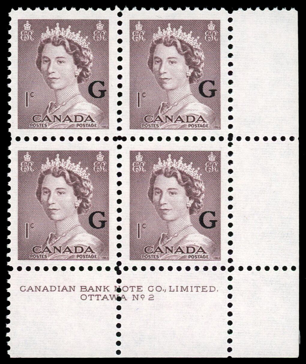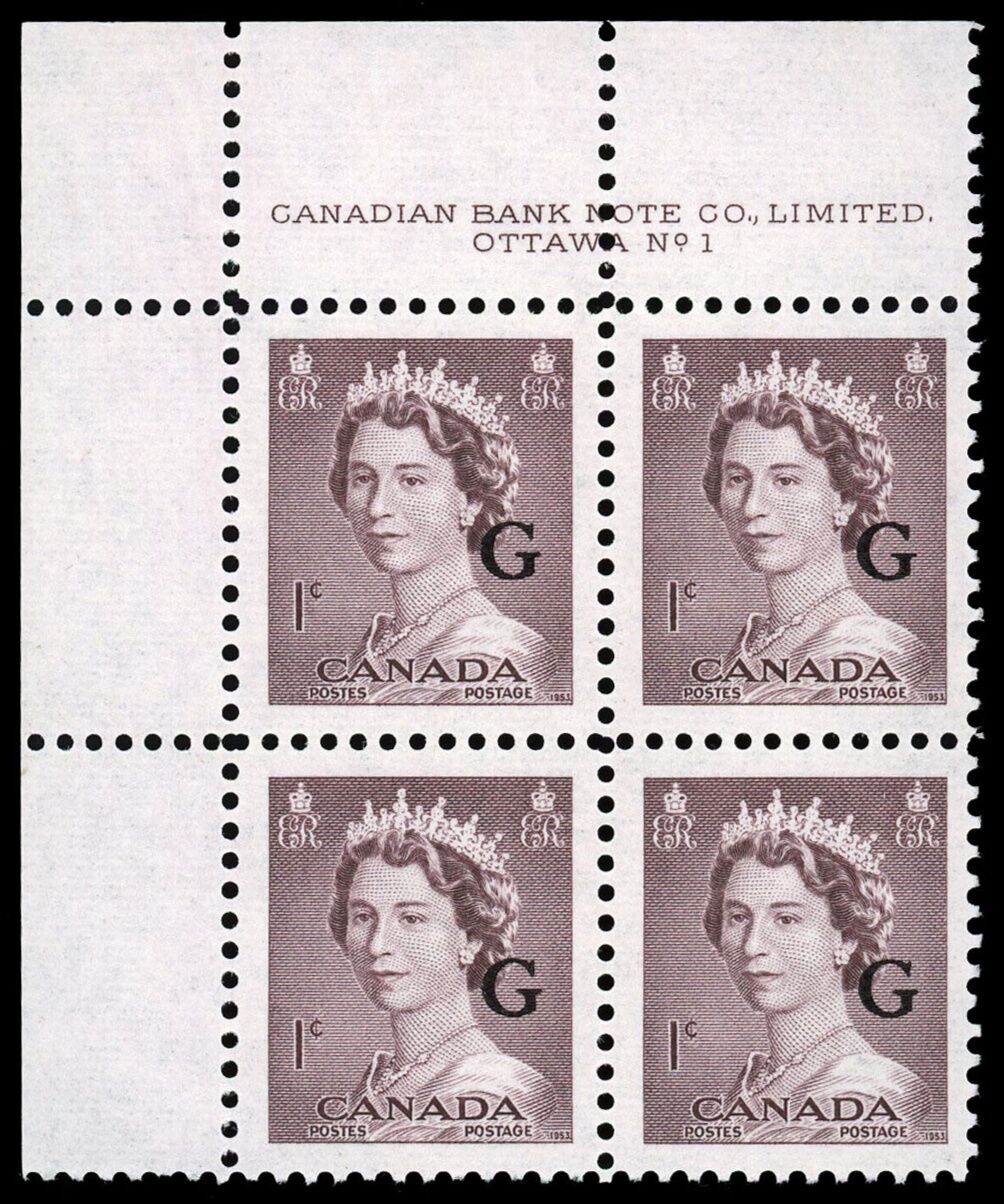 Queen Elizabeth II, overprinted "G" - Violet Brown. 1¢. Canada overprinted official stamp O33 from the "Krash" portrait issue.