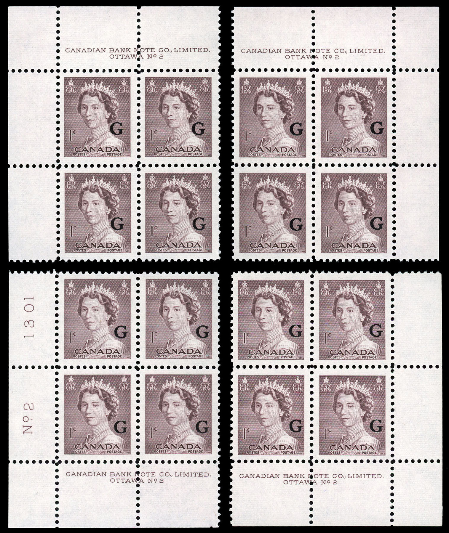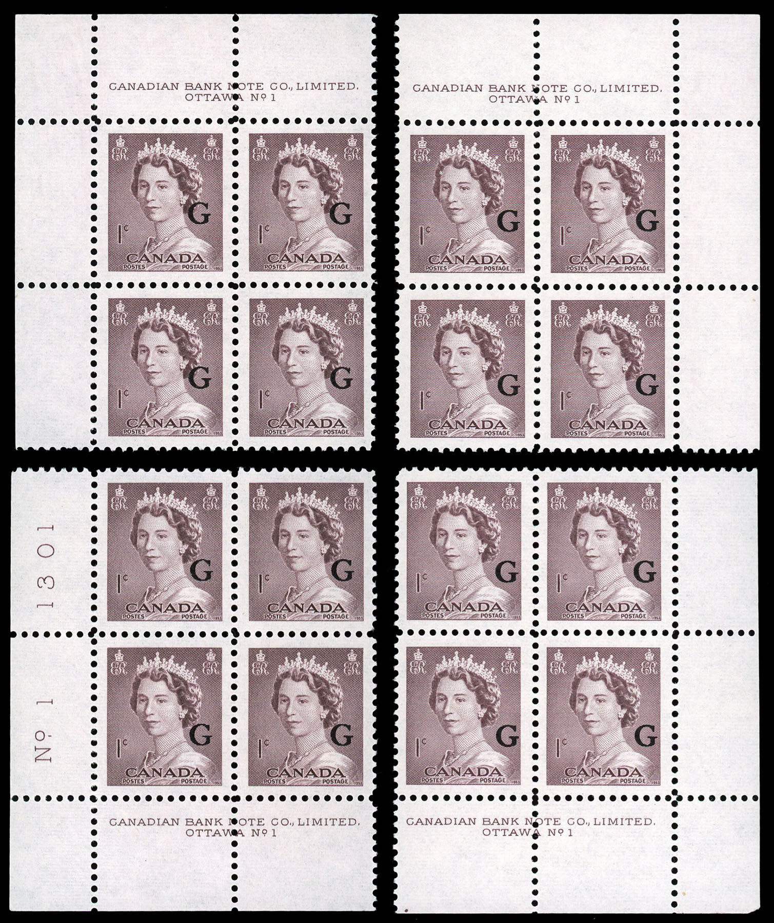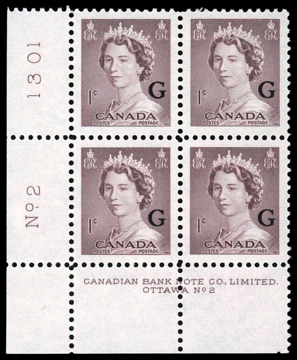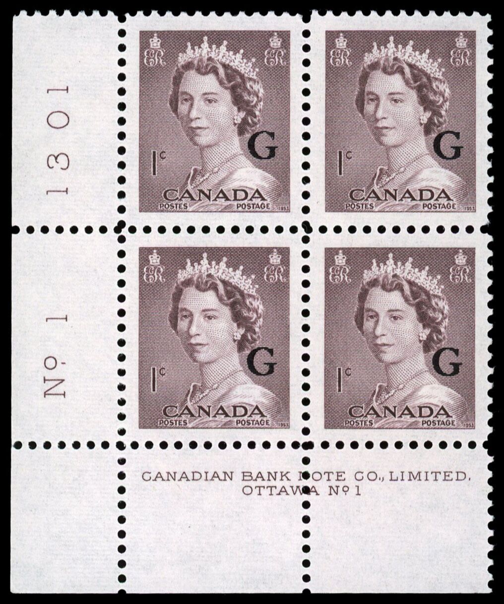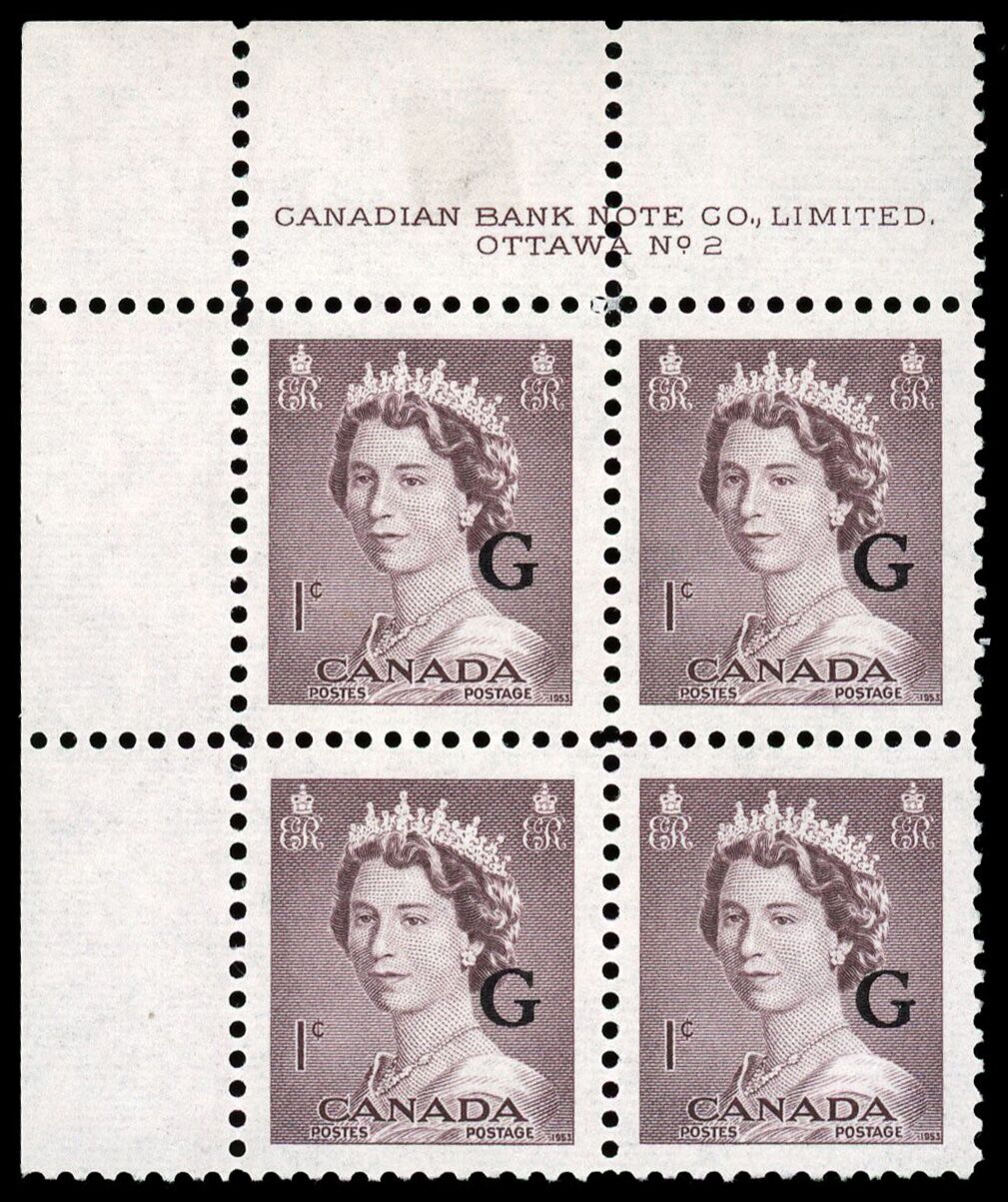 Queen Elizabeth II, overprinted "G" - Violet Brown. 1¢. Canada overprinted official stamp O33 from the "Krash" portrait issue.