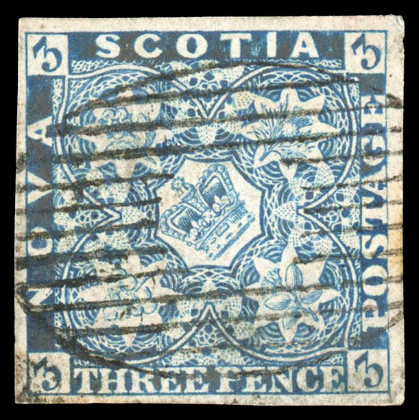 2nd Nova Scotia stamp, 3 "Pence", blue, lightly cancelled, four full margins, a beautiful stamp!