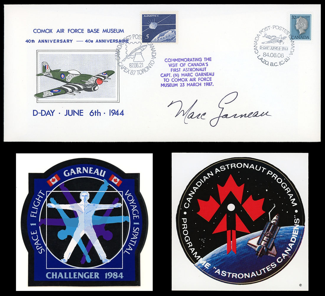 Very special event cover commemorating the visit of Canada's first Astronaut, Captain Marc Garneau to Comox Air Force museum on March 23 1987. The cover is signed by late Marc Garneau and comes with 2 Canadian astronaut program badges.